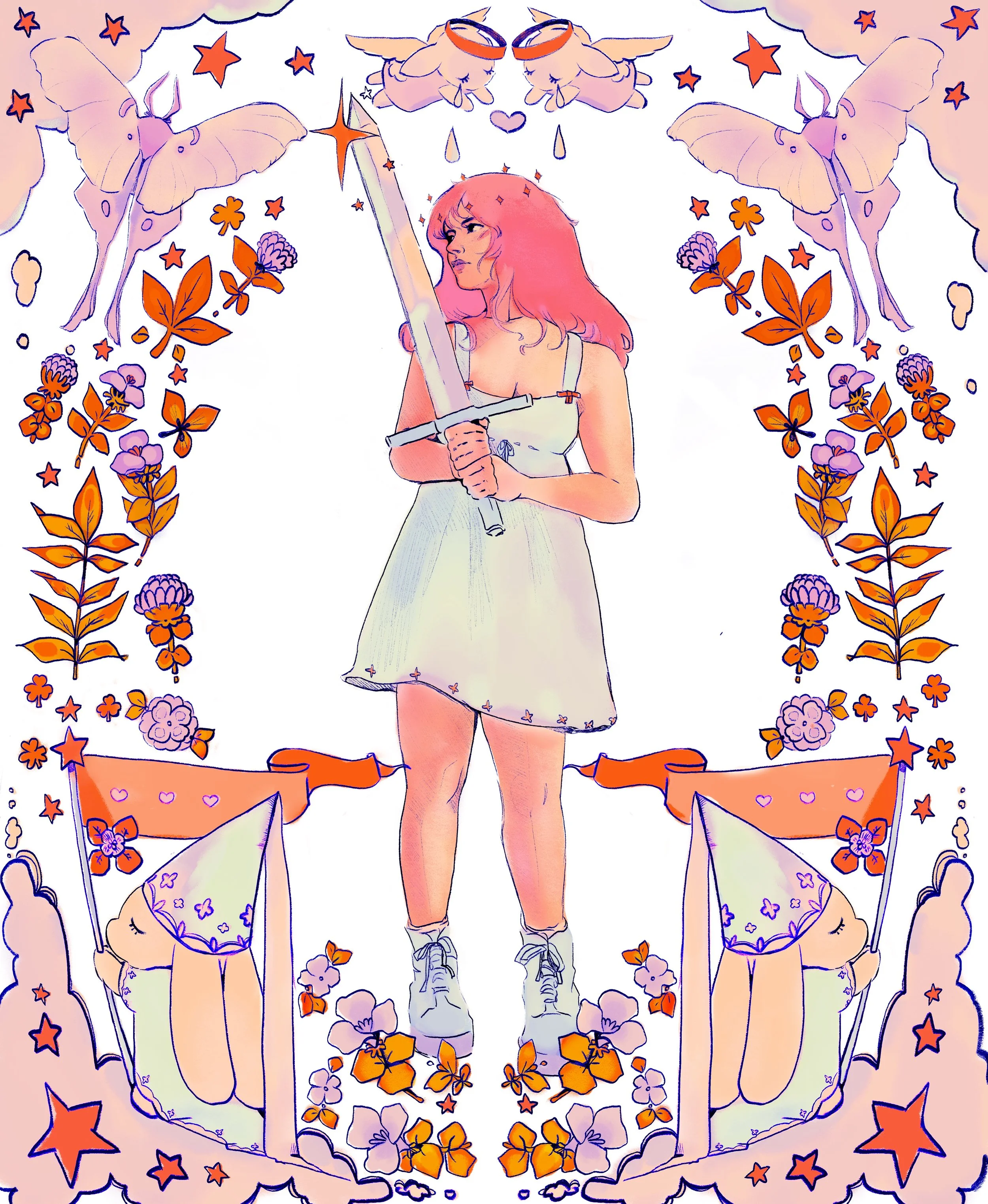 My art is hyper feminine, saturated, whimsical, and lush. I am a young female artist who lives in the forest and those aspects of myself exist in my art. I am in touch with my inner child and a lot of my subject matter is inspired by this. I am painting through the eyes of my inner child who saw no darkness in the world and was only focused on things that made me laugh, like silly cute characters, or things in nature that enchanted me, such as clovers in the grass. I also love to change up my mediums and I often try to challenge myself to attempt new techniques in my work. I do both fine arts and illustration which I believe helps me to be a well rounded artist. In this portfolio I give examples of my range as an artist and as you scroll through you will find everything from ink washes and oil painting to digital art and watercolor.